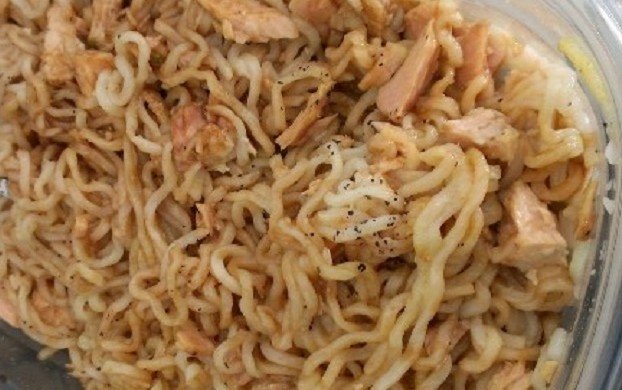 5- نسكب النودلز بالطون في وعاء وتصبح جاهزة للتقديم