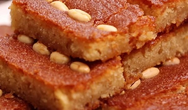 - نخرج الصينية ونصب فوقها القطر الفاتر ونوزعه جيداً حتى تتشربه القطع كلها وبذلك تصبح الهريسة جاهزة للتقديم .