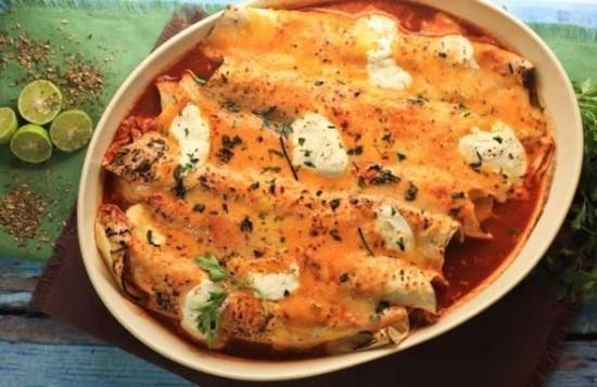 5. تصب الصلصة فوق الانشيلادا ثم ترش بالجبنة والقليل من الكريمة.