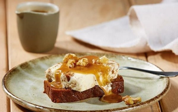 - قطعي بودينغ التمر إلى 8 شرائح، قدمي شريحة من الآيس كريم على وجه كل قطعة بودينغ ورشي الصوص الساخن فوقهم ثم الجوز.