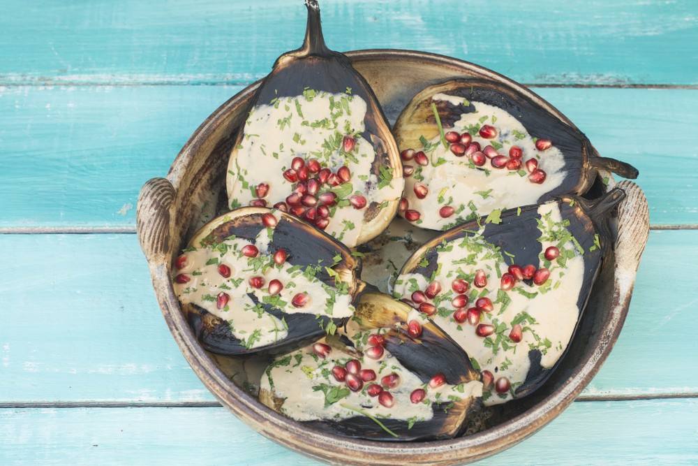 - يوضع الباذنجان على الشواية، ويقلب على الجانبين حتى ينضج.