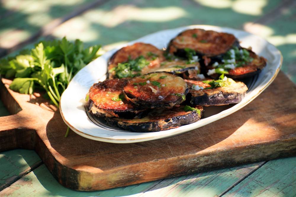 - تقلى شرائح الباذنجان في الزيت، ويقلب على الجانبين حتى يحمر.