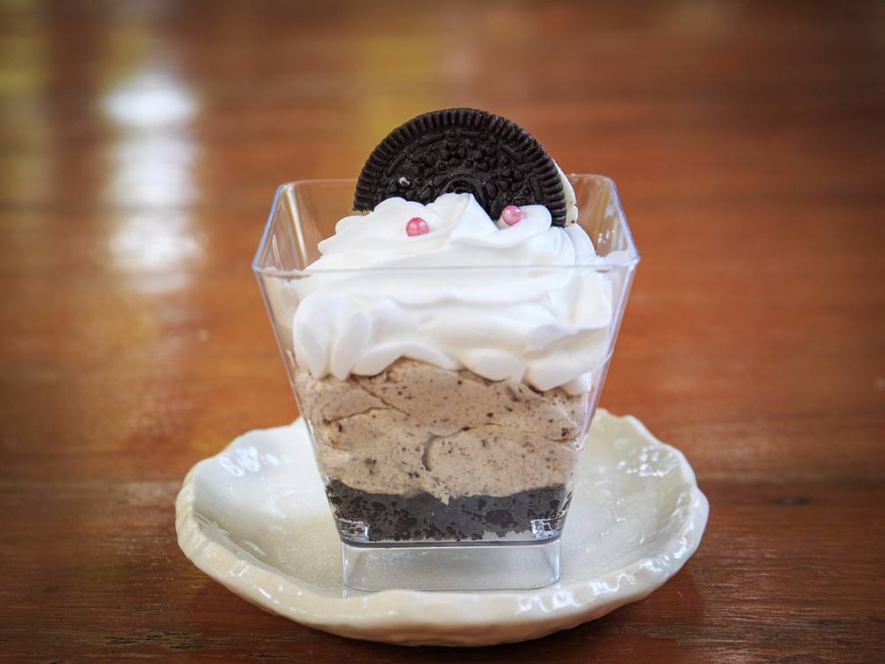 - قسمي باقي كمية الكريمة على الأكواب ثم ضعي قطع الأوريو الكاملة ثم يقدم.