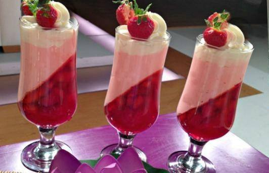 - نضع مقدار من الكريمه المخلوطه على الجيلى ونزين بالكريمه المتبقية وحبات الفراولة و النعناع