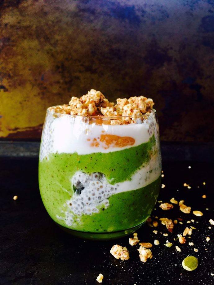 - قسمي مزيج بذور الشيا و لبن الجوز هند الى 2 كوب ثم قسمي سموثي الكيوي فوق مزيج بذور الشيا و لبن الجوز هند.
