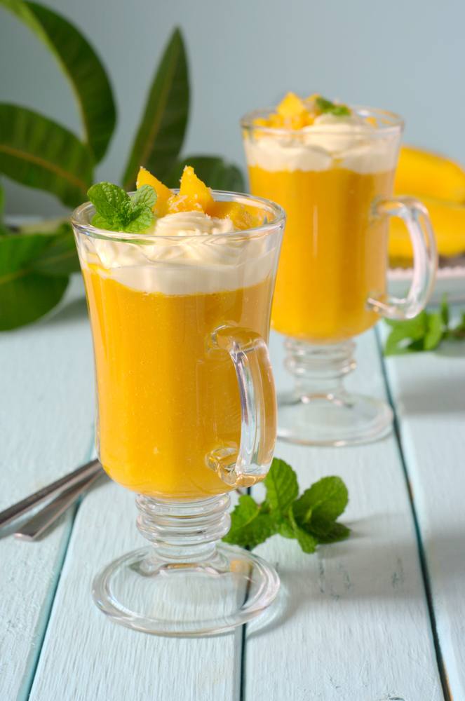 - يهرس حليب جوز الهند والمانجو والموز في الخلاط حتى يصبح ناعم ثم ينقل إلى طبق ويضاف الزبادي ويقلب بخفة حتى يتشكل شكل رخامي فقط.