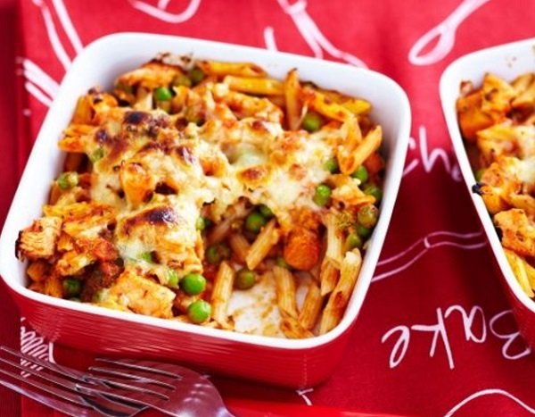 2. نطهو القرع في وعاء كبير من الماء المغلي لمدة 5 دقائق ثم نضيف البازلاء والبروكلي ونتركها لمدة دقيقة ثم نصفي المكونات جيداً . نحمي الفرن إلى درجة حرارة 180 . نخلط الدجاج والباستا ومزيج القرع وصلصة الطماطم في وعاء كبير ونحرك المكونات جيداً ثم نوزع المزيج على أطباق الفرن ونرشها بالجبنة ونضعها في الفرن لمدة 10 دقائق ثم نخرجها وتصبح جاهزة للتقديم .