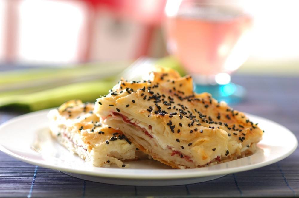 - يوزع فوقها شرائح البسطرمة، ثم توضع الطبقة الثانية من العجين.