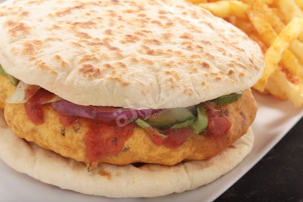 - يفرد الحمص على قواعد الخبز الحمص و يوضع عليها الجرجير و البرجر و الفلفل و الفيتا و يوضع عليها قمة الخبز و تقدم .