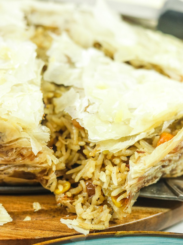 - بعد أن يستوي الأرز نقلبه جيداً ونضيفه داخل العجين في القالب ونرش طبقة من اللوز المحمص ثم نرد زوائد العجين حتى نغلق القالب بالكامل .