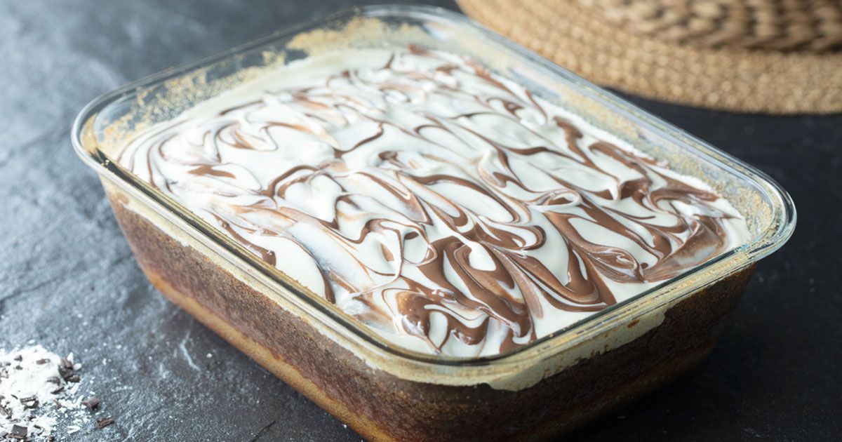 13- للتزين: أسكبي الشوكولاتة البيضاء المذوّبة على وجه البسبوسة.
