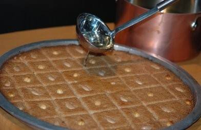 12. تُعاد وتخبز لحوالي 20 دقيقة أخرى أو إلى أن تنضج. -تُسقى البسبوسة بالشراب وهي ساخنة، وتعاد إلى الفرن لمدة 5 دقائق.