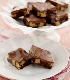 يصب الشوكولاتة بالحليب المذابة على الوجه و تبرد حتى تتماسك ثم يقطع 16 مربع و يخزن في وعاء محكم في الثلاجة لحين التقديم .