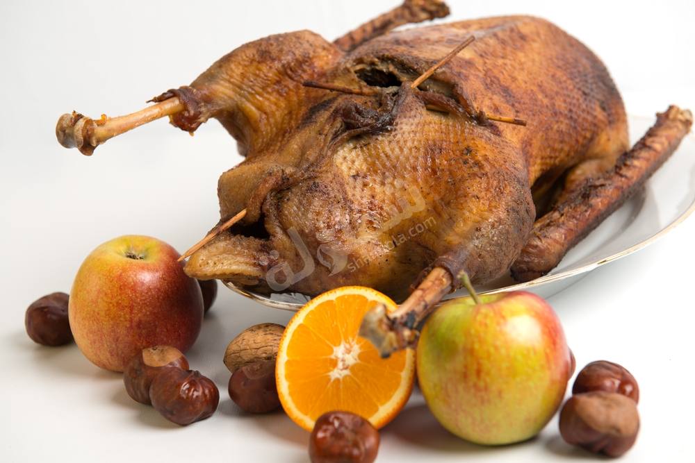 1. تغسل البطة جيدا وتنقع بماء وملح وخل للتخلص من أى روائح ثم تجفف جيدا بمناديل مطبخ .