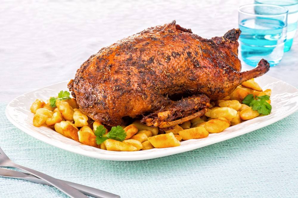- ترفع البطة من على النار وتوضع في صينية، وتدخل الفرن على درجة حرارة 140، لمدة 20 دقيقة، ثم تعرض للهيب الشواية على الجانبين.