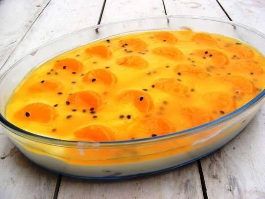 11. تُخرج صينية حلوى الحليب من الثلاجة، وترص فصوص البرتقال أو اليوسفى عليها.