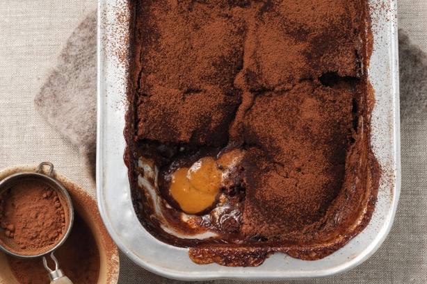 - يسخن الفرن إلى 180 درجة مئوية ويقلب الدقيق مع الكاكاو والسكر والزبدة والحليب والشكولاتة البيضاء في طبق ويقلب حتى تصبح ناعمة ثم تفرد في طبق حراري سعة 10 كوب ثم نعمل ثقوب عميقة في القمة و تملئ بالكراميل بإستخدام ملعقة يفرد قمة الخليط لتغطية الكراميل .