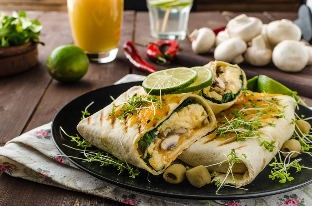 - قدمي بوريتو البيض بالمشروم مع البطاطس المحمرة و الثومية.