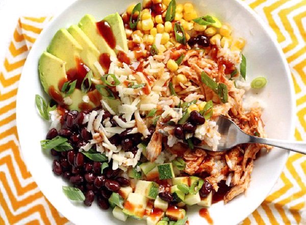 3. نوزع المكونات على أربعة أطباق للتقديم حيث نضع الأرز في أسفل الطبق ثم نوزع على كلٍّ منها الدجاج والفاصوليا والذرة والكوسة وبرش الجبن والبصل الأخضر وشرائح الأفوكادو ونزين بقليل من صلصة الباربكيو فوق كل طبق وبالتالي يصبح بوريتو الدجاج بصلصة الباربكيو جاهزاً للتقديم ويمكن وضع الأطباق في البراد إلى أن يحين وقت التقديم .