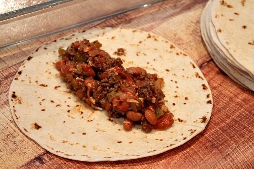 - ضعي بعض مزيج لحم البقر فوق خبز التورتيلا الساخن، لفيهم وقدميهم.