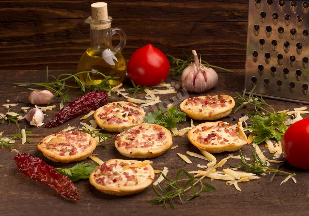 1. يسخن الفرن إلى 220 درجة مئوية وتدهن صينية فرن كبيرة وبإستخدام قطاعة مستديرة مقاس 12 سم يقطع 4 دوائر  من قاعدة البيتزا و توضع الدوائر على الصينية المعدة .