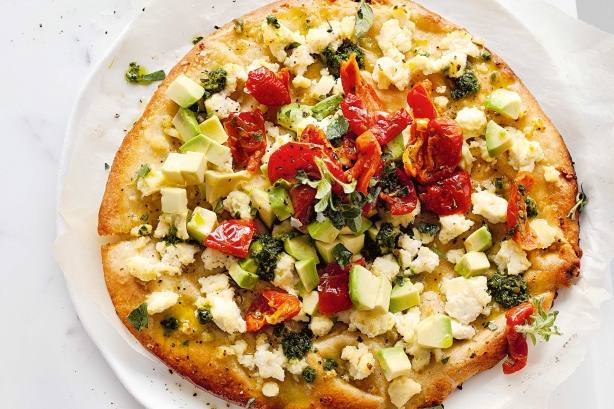 - في هذه الأثناء تقطع الأفوكادو إلى مكعبات صغيرة وتقلب مع عصير الليمون ثم تخرج البيتزا من الفرن وينثر عليها الأفوكادو والطماطم الشبه مجففة والزعتر والبيستو .