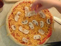 تدهن العجينة بالجبن السائل، يوضع الفطر، الفلفل المقطع والزيتون الأسود، يرش البهار وجبنة الموزاريلا فوقها.
