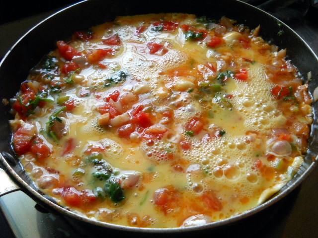 1.  يخفق البيض ويوضع عليه الملح و الفلفل و البصل والطماطم .