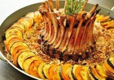 - يُتبل الظهر بنفس تتبيلة البصل ثم يُوضع في منتصف الصينية بين حلقات الخضروات ويُوضع في منتصف التاج حبة بطاطس كبيرة بالقشر للحفاظ على شكل التاج (كما يُمكن وضع طبق معدني به بصل صغير مشوي).