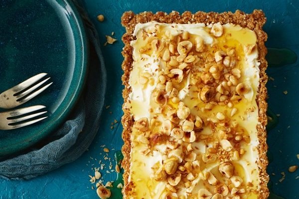 تارت السمسم ، وصفة حلويات مناسبة من المكسرات مع شاي الصباح، تارت شهي من الزبادي، البسكويت، اللوز، الصنوبر، البندق، التمر، مع بذور السمسم والعسل على الوجه.