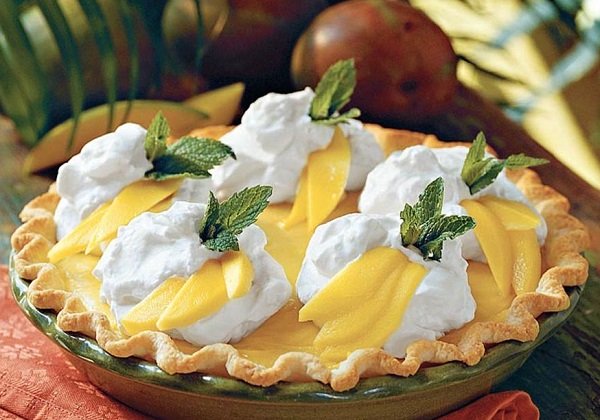 تارت المانجو بالنكهة المدارية الاستوائية عن طريق استعمال نكتار المانجو مع حشوة الكريمة، ثم تزين الفطيرة بطبقة من الكريمة المخفوقة وشرائح مانجو طازجة وأوراق النعناع .