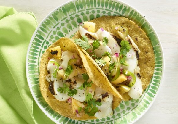 تاكو السمك ، لفائف مغذية من خبز التورتيلا محشوة بفيليه السمك الأبيض المشوي مع صلصة من قطع الأناناس الصغيرة، البصل، الفليفلة مع الكزبرة الخضراء.