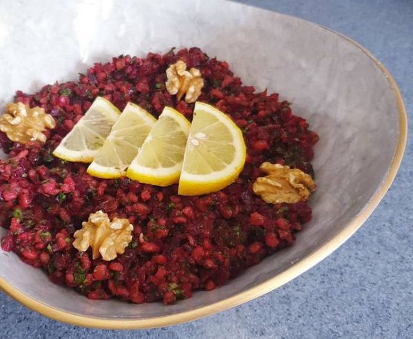 تبولة الشمندر بالبرغل طبق من المقبلات الشهية والغنية بالفوائد الغذائية بمكونات أساسية هي الشمندر والبرغل والبقدونس وعصير الليمون ودبس الرمان .