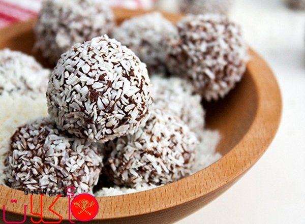 - نأخذ كمية صغيرة من هذا الخليط، ونضعها بين راحتي اليدين لتشكيل كرات تشبه كرة الغولف أو أصغر قليلاً، ثم نضع الكرات في صحن مبشور جوز الهند لتتغطى بشكل كامل
