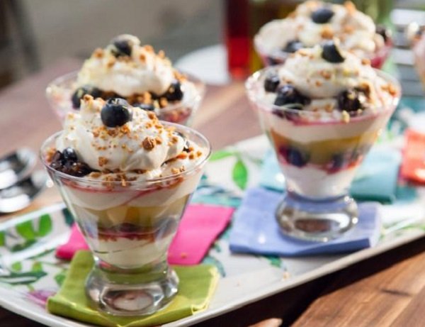 - في كل وعاء حلوى أو كأس زجاجي. ضعي طبقة من حشوة التشيز كيك، ثم مهروس التوت، ثم الكوكيز المطحون وخاثر الليمون. حتى يمتلئ كل وعاء. وضعي على الوجه مغرفة من الكريمة المخفوقة المحتفظ بها جانباً. وزينيه بالكوكيز المطحون المتبقي، القليل من التوت والمزيد من قشر الليمون.