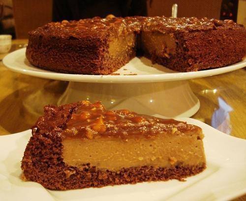 5. في حمام مائي نخلط 3 سنكرز و نصف علبه قشطه و نزين به الكيكه و نتركها بالفريزر نصف ساعة، ثم تقدم .