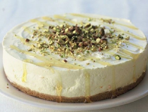 - نخفق في وعاء آخر كلاً من الكريمة واللبن ومزيج عصير البرتقال وبرش وماء زهر البرتقال . نسكب المزيج فوق قاعدة البسكويت ونتركه في التبريد لليلة كاملة . عند التقديم نضع قالب التشيزكيك في طبق التقديم ونزينه بالعسل والفستق .