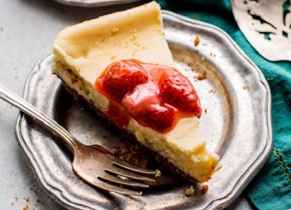 - اخبزي التشيز كيك لمدة 40 – 45 دقيقة، حتى يستقر السطح السفلي، وتخرج الشوكة نظيفة تقريباً، بعد غرزها في المنتصف، أخرجيه من الفرن واتركيه يبرد تماماً في الصينية على رف التبريد.