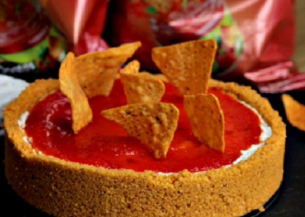 - نضع هذا المزيج فوق قاعدة قالب التشيز كيك ونضعه في التبريد حتى يصبح قوام المزيج صلباً . بعد ذلك نخرج القالب من التبريد ونضع أعلاه مربى الفليفلة الحارّة ونزينه برقائق دوريتوس الشهية .