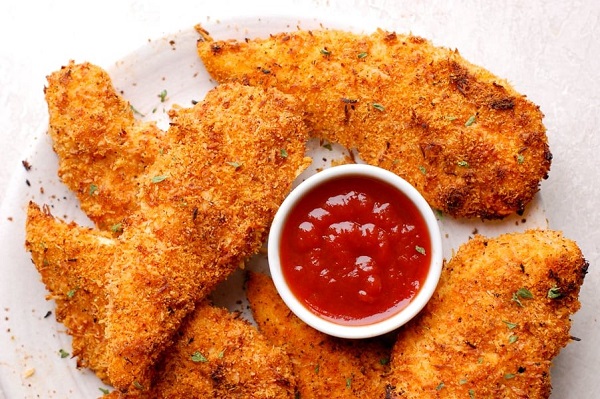 - نقدم التشيكن ستربس بجانب الكاتشاب أو المايونيز حسب الرغبة وصحة وهنا .