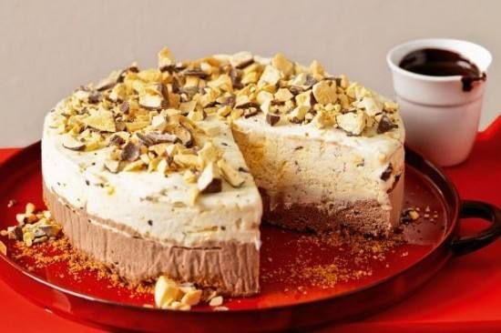 - توضع فى الفريزر و تترك لمدة ساعتين ثم تخرج من الفريزر و تزين بالكريم شانتيه و قطع الشيكولاتة و المكسرات.