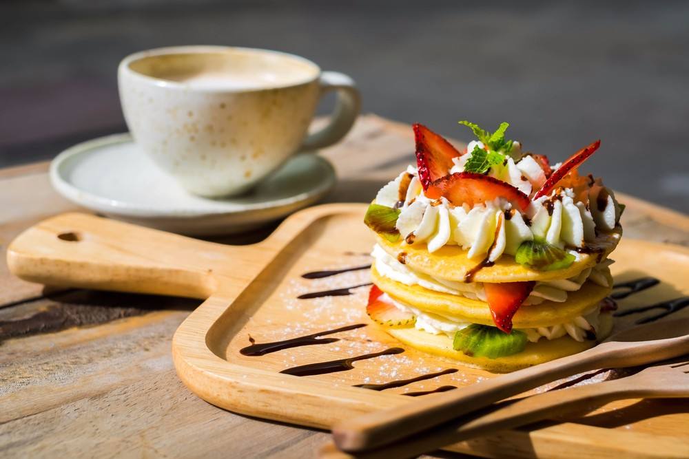 - تكرر العملية بحيث تصبح كل تورتة عبارة عن 3 طبقات بان كيك بينهم شرائح الكيوي والفراولة والكريمة المخفوقة.