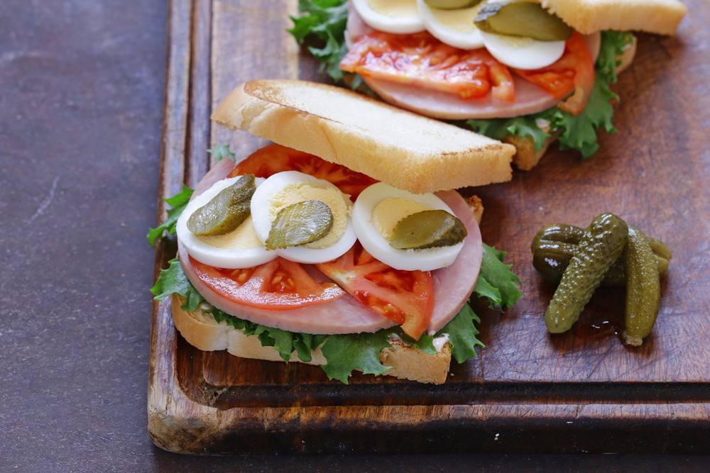 3. ثم يوضع اللانشون وشرائح الطماطم، ثم يوضع البيض ومخلل الخيار.