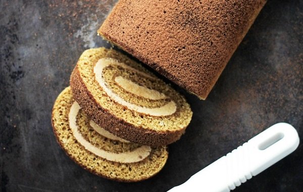12. ضعي الكيك على سطح العمل فوق ورق الزبدة، وادهني سطحه بشراب الإسبرسو، ثم ضعي الحشوة عليه، ثم قومي بلفه كالرول بشكل مُحكم، ثم قومي برشه ببودرة الكاكاو ليتغطى كاملاً