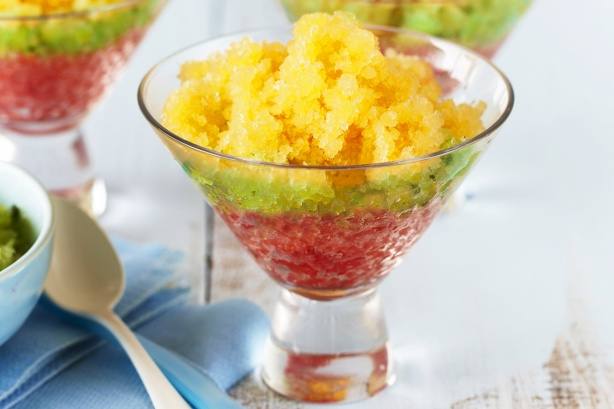3. يقسم شراب السكر بالتساوي بين حاويات ويقلب ليتجانس ويوضع في الثلاجة ويجمد لمدة 2 ساعة حتى تتجمد حول الحواف ويكشط ويقلب بالشوكة ويجمد مرة أخرى ونكرر عدة مرات حتى يجمد تماماً ويصب ثلج مجروش ثم يغطى بغطاء ويجمد لمدة ليلية .