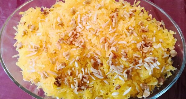 - نرفع جزرية اليقطين عن النار ونتركها تبرد تماماً ثم نزينها باللوز ونقدمها .