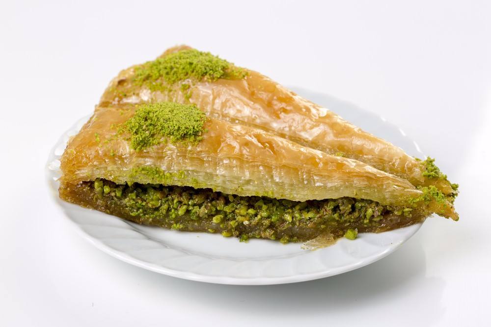 - يوزع خليط الفستق فوق الجلاش، ويراعى توزيعه بالتساوي على كامل الصينية.