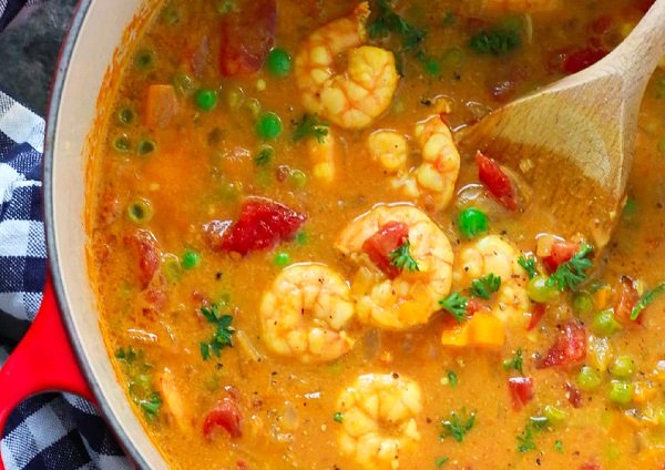 - نقوم بإضافة الطماطم والبازلاء الخضراء ونسكب حليب جوز الهند بالتدريج ونحرك ونترك المكونات حتى الغليان لمدة 3-5 دقائق، ثم نضيف الجمبري ونترك المكونات على نار هادئة .