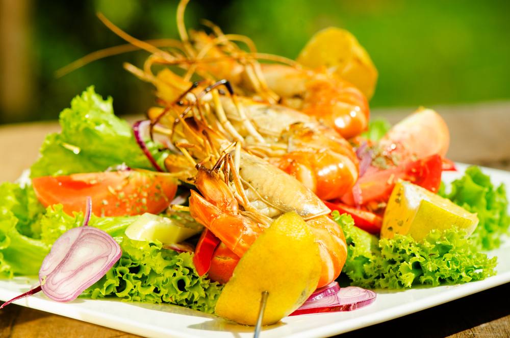 وتقدم أسياخ الجمبرى مع السلطة وشرائح الليمون .