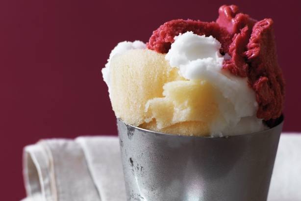 بإستخدام مغرفة الآيس كريم يوضع سوربيه الشهد والراسبيرى والليمون في أطباق التقديم .